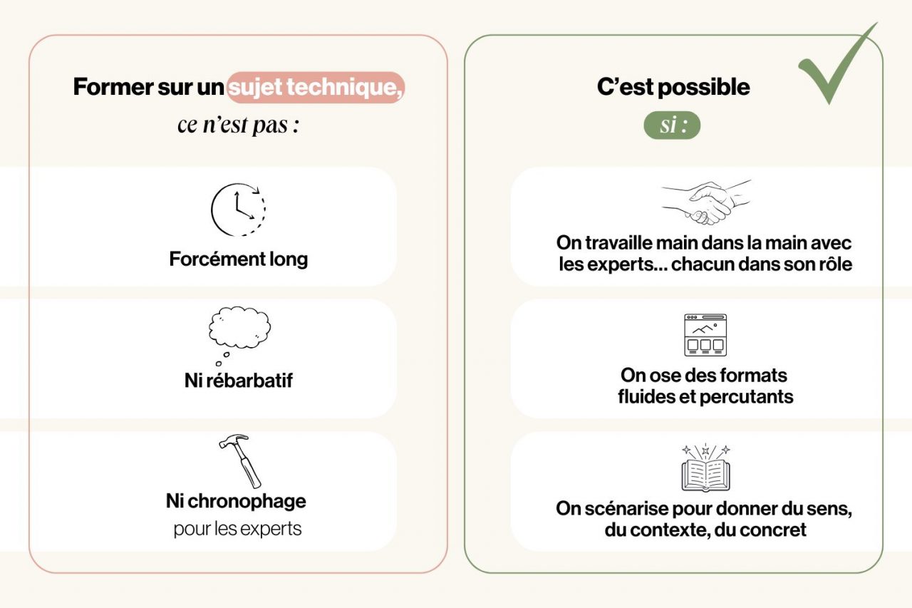 Alors LA question qui revient souvent, c’est bien : comment former sur des sujets complexes sans simplifier à outrance ni mobiliser les experts pendant des mois ?