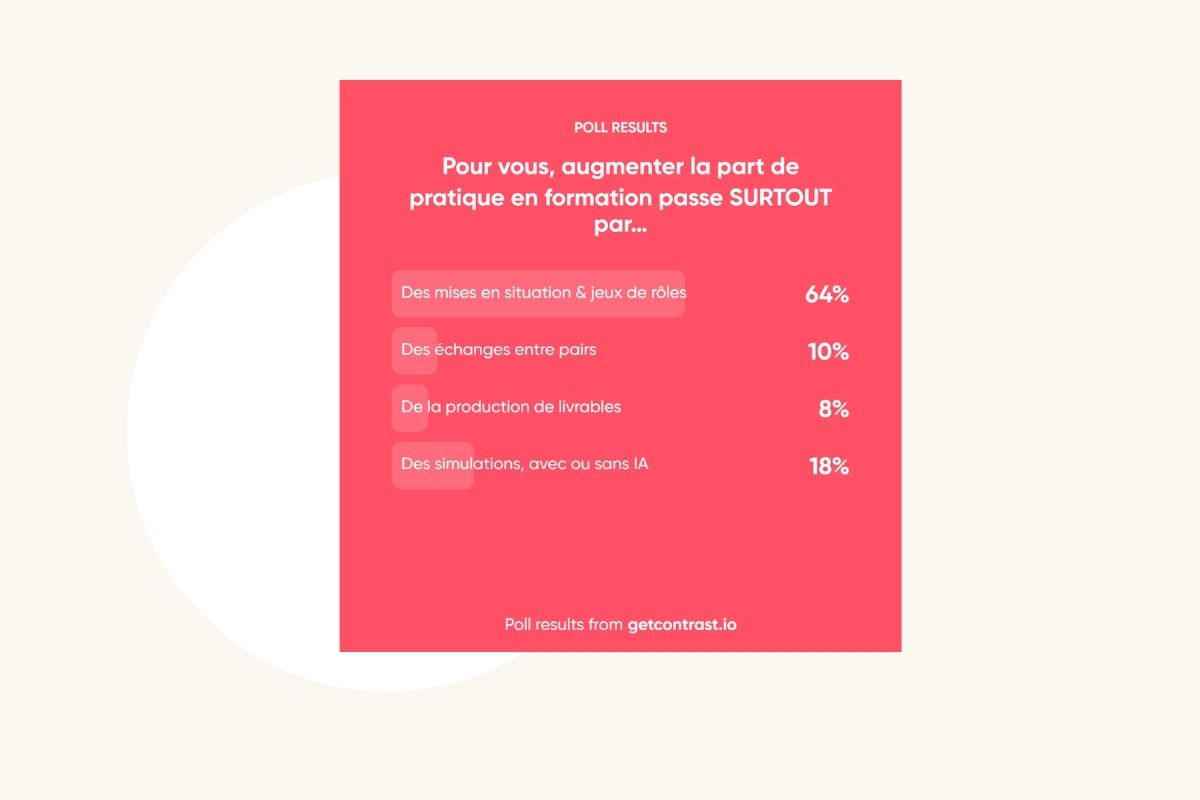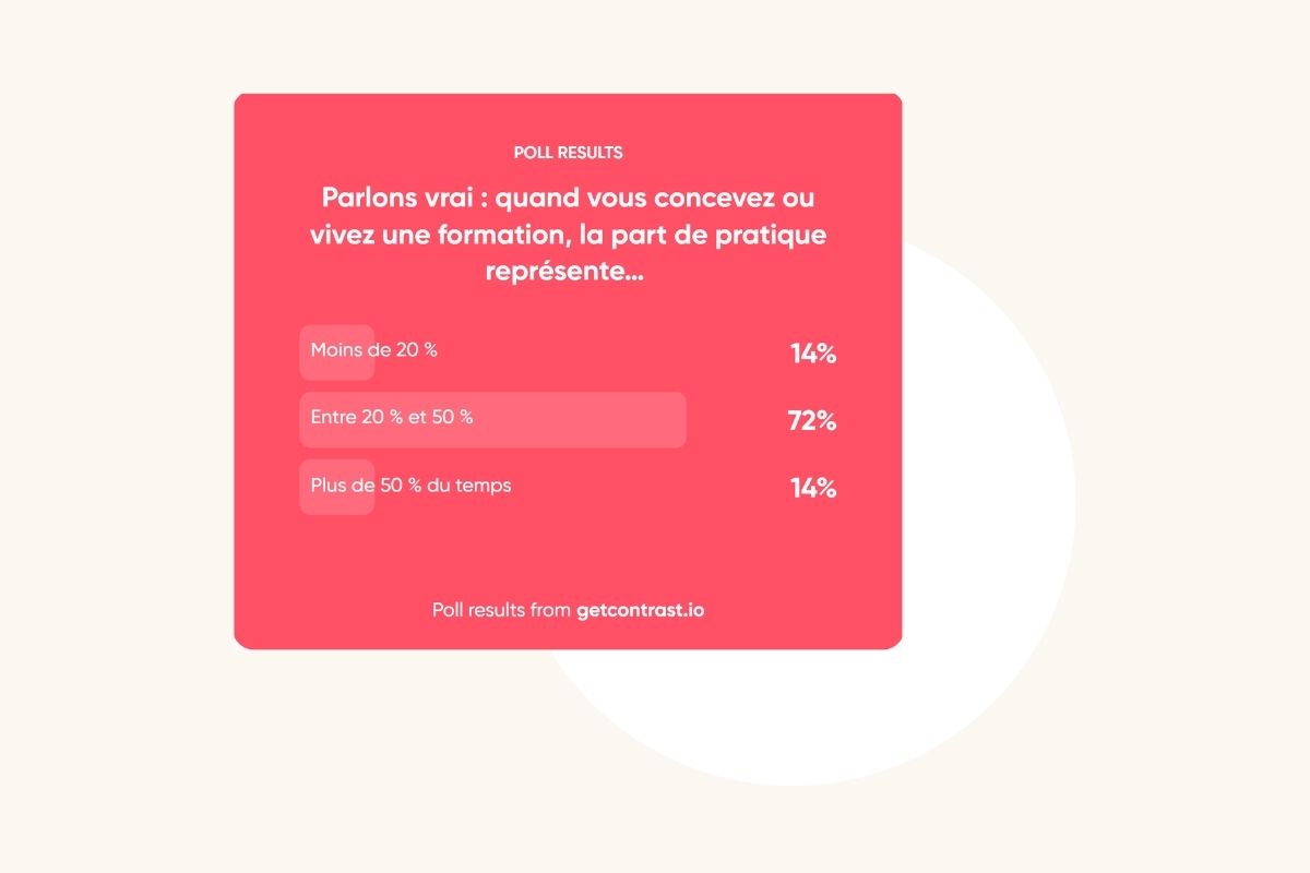- 72 % des participants estiment intégrer entre 20 % et 50 % de pratique dans leurs parcours de formation